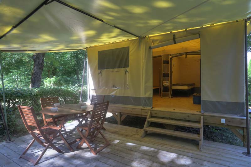 Our 23 m² furnished tents for 6 people are installed on a wooden platform 50 cm from the ground and have a terrace, ideal for family activities.